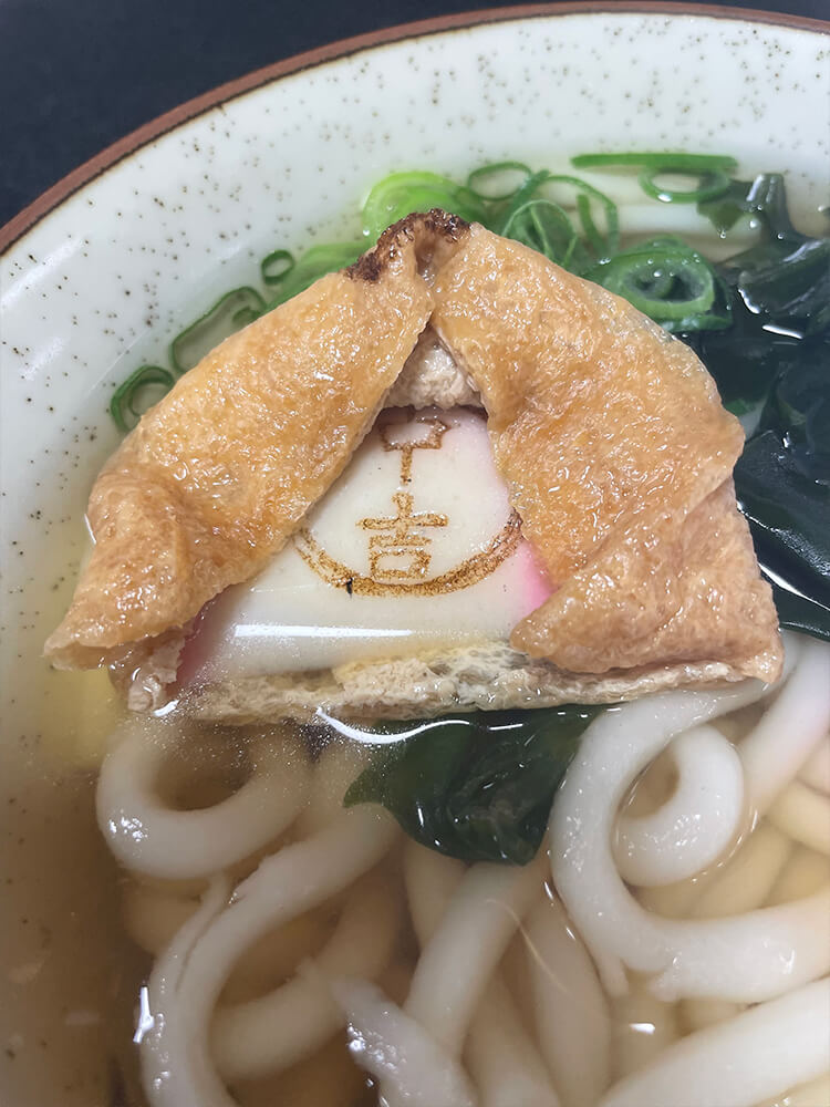 参道のレストラン名物「おみくじうどん」。大きなお揚げの中に秘密が隠されています。
