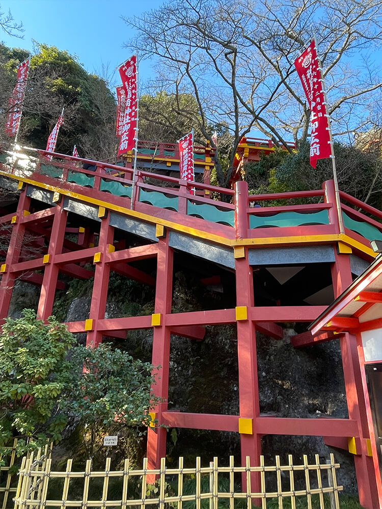 祐徳稲荷神社の骨組みは、「懸造(かけづくり)」と呼ばれる崖に張り出した舞台構造が特徴的。