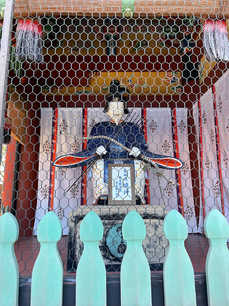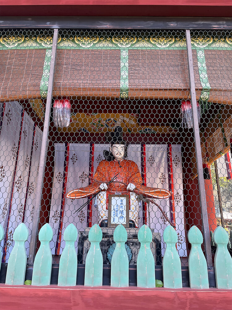 楼門を守る随身(右大臣)。木造ではなく有田焼で作られているのが特徴です。