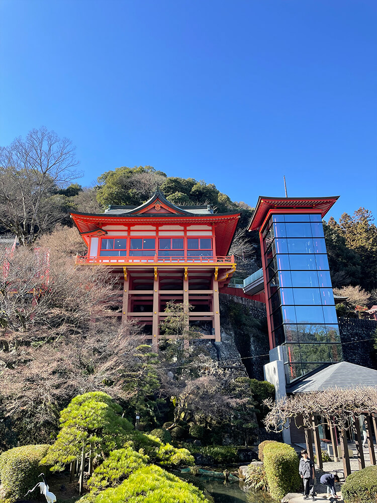 ガラス張りの塔は本殿への移動を補助するために設置されたエレベーターです。